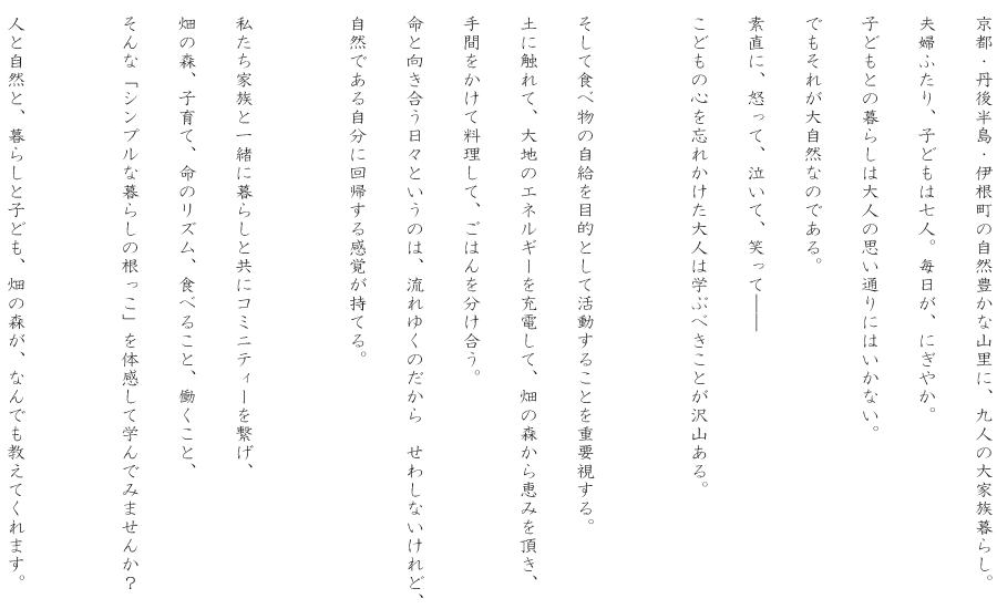 京都府の最北端の自然豊かな場所で農と暮らしと子育てをテーマに活動を続けて15年以上たちました。